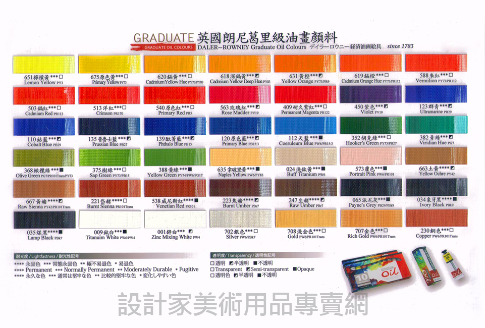 英國DalerRowney老廠牌自1783年起建廠已超過200多年,也加入新的科技,研發出全新的系列-朗尼葛里級(GRADUATE)百年純熟的製造方式提供軟硬適中、優良品質的油畫顏料。並且帶給使用者好上手的作畫過程!即使是初學者,也非常適合!
