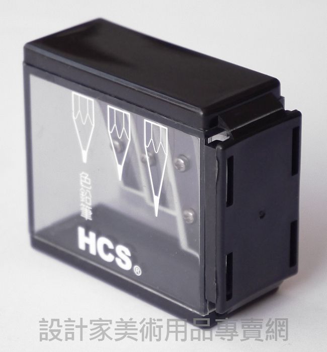 第三個孔是專門用來削色鉛筆的,一般如果拿色鉛筆用普通的削筆器的話最尖端會很容易斷裂,但是HCS考量到這點它的色鉛筆孔並不會將它削尖,而是保持在不會斷裂又剛好的情況。