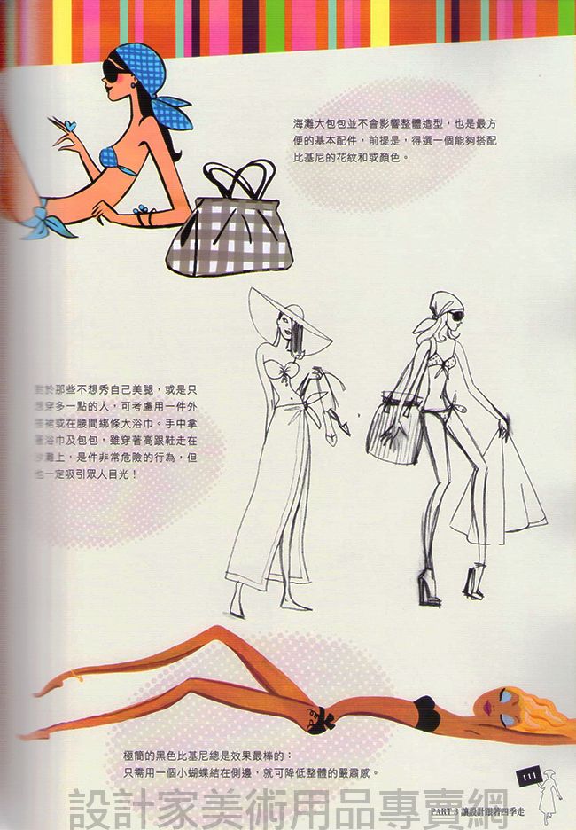 詳細介紹每種繪圖工具的特性,並教你如何靈巧應用繪圖工具,將之發揮到最佳屬性。並介紹時裝圖中的模特兒身體上的比例、不同臉部表情、髮型、妝容、配件(內衣、飾品、包包ect.)的基本畫法,再詳細介紹各種衣服材質、皺摺、明亮、布料印花色系上的搭配畫法。