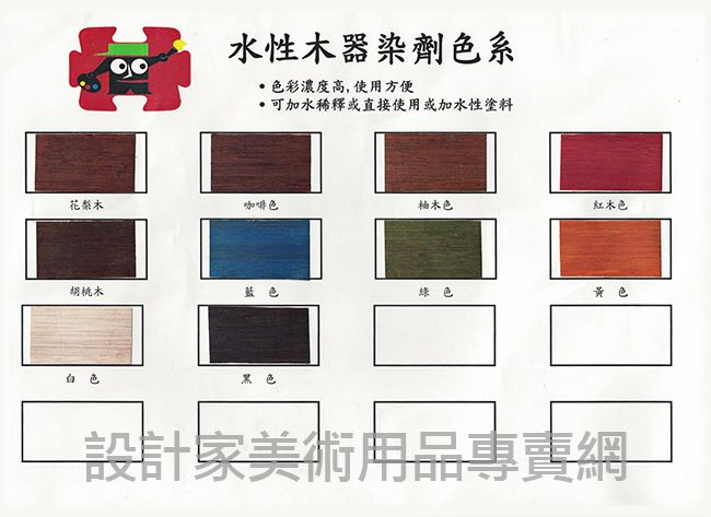 ● 色彩濃度高,使用方便,能夠有效滲透木器材質達到染色效果。 可加水稀釋使用或加入水性塗料。
