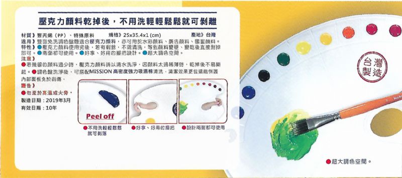 特性:壓克力顏料使用完後,若有剩餘,不需清洗,變乾後直接剝掉。