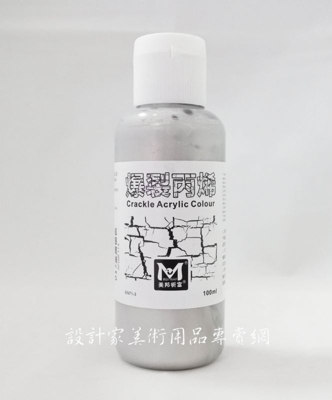 製作過程: 1. 使用壓克力顏料打底為加快乾燥速度,可以用吹風機加熱至其完全乾透。 2. 打底壓克力顏料乾後塗上透明的爆裂媒介劑,可以再次用吹風機加熱加快乾燥速度。 3. 等表面乾後在最上面塗上爆裂丙烯一分鐘後就可以看見其爆裂效果了。 4. 爆裂丙烯的厚薄程度決定裂紋大小,塗得越薄裂紋越小,反之越大。 |