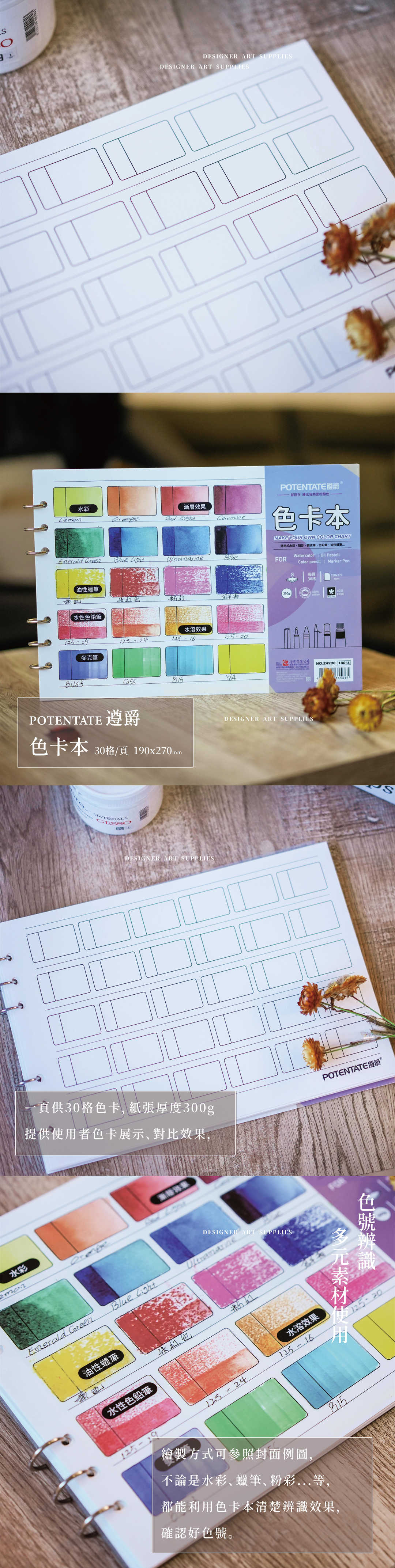 一頁供30格色卡,紙張厚度300g提供使用者色卡展示、對比效果, |