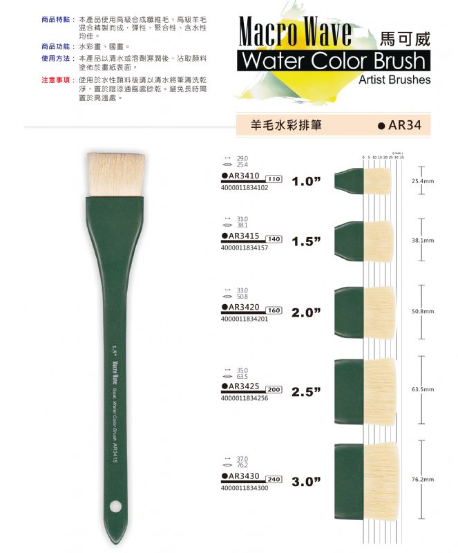 Macro Wave馬可威 AR34 白羊毛國畫水彩排刷 3吋