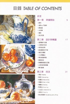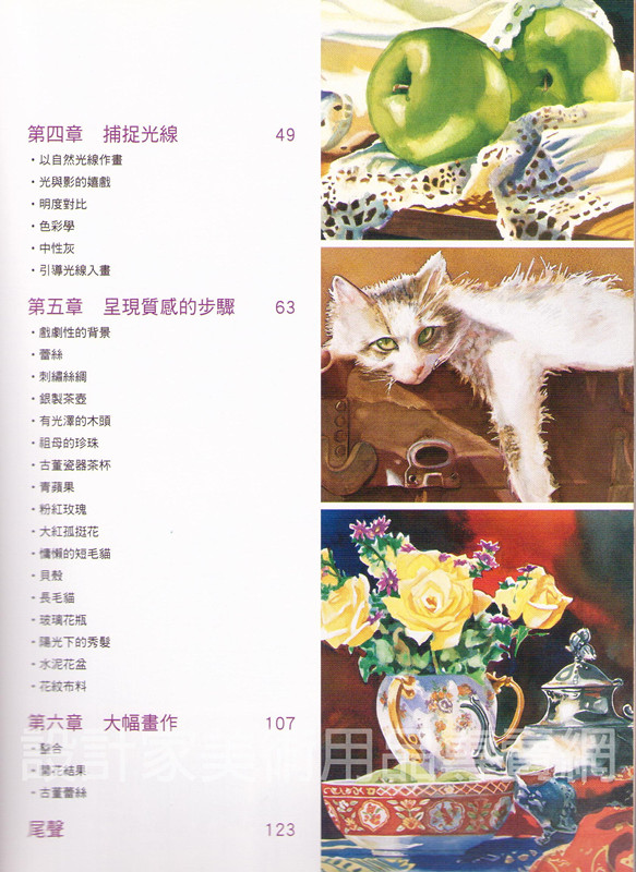 第五章示範各種物件質感的表現方法。絲綢、銀器、木頭、瓷器、玻璃及毛髮都有細膩的解說。