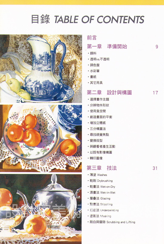 第三章以清楚的圖示來講解各種技法的表現方法。如乾畫法及濕畫法的特性,打底法與遮蓋法的不同,薄塗及乾刷的技巧。