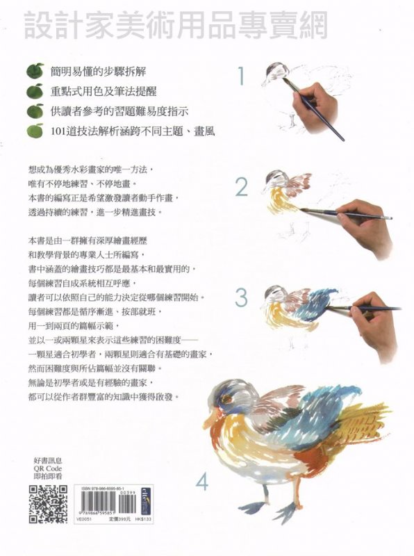 在繪畫技巧的部分,本書涵蓋的都是最基本和最實用的。在介紹完水彩作畫材料後,接著就是許多範例,讓讀者得以練習不同的畫技。雖然本書標榜「101招水彩技法完全解析」,但是實際動手畫以後,就會發現可能不需要或局限這些技法。只要一枝畫筆、幾張畫紙、一些顏料和幾個範例,就足夠讓初學者開始動手畫,並且會不時地發現新的作法。本書由一群有深厚繪畫經歷和教學背景的專業人士所編寫,無論初學者或是經驗老道的畫家,都可以從作者群豐富的知識中獲得啟發。